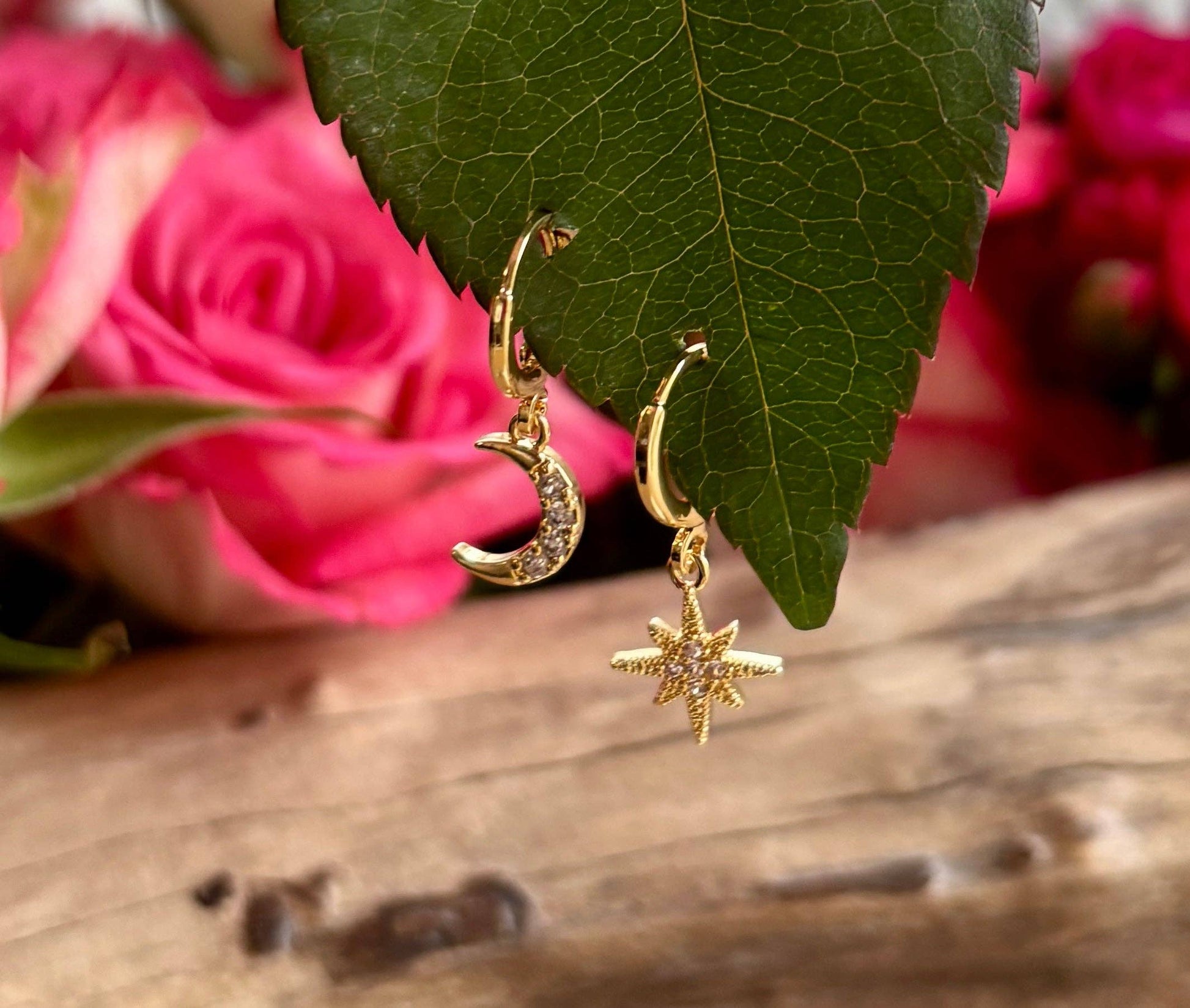 These 14ct gold-plated earrings feature a mismatched moon and star design perfect for multiple ear piercings or a standalone huggie. The crescent moon and star are encrusted with sparkling cubic zirconia, adding a touch of elegance. Both celestial shapes are beautifully mounted on gold hoops, offering a stylish and versatile look for a variety of ear configurations.
