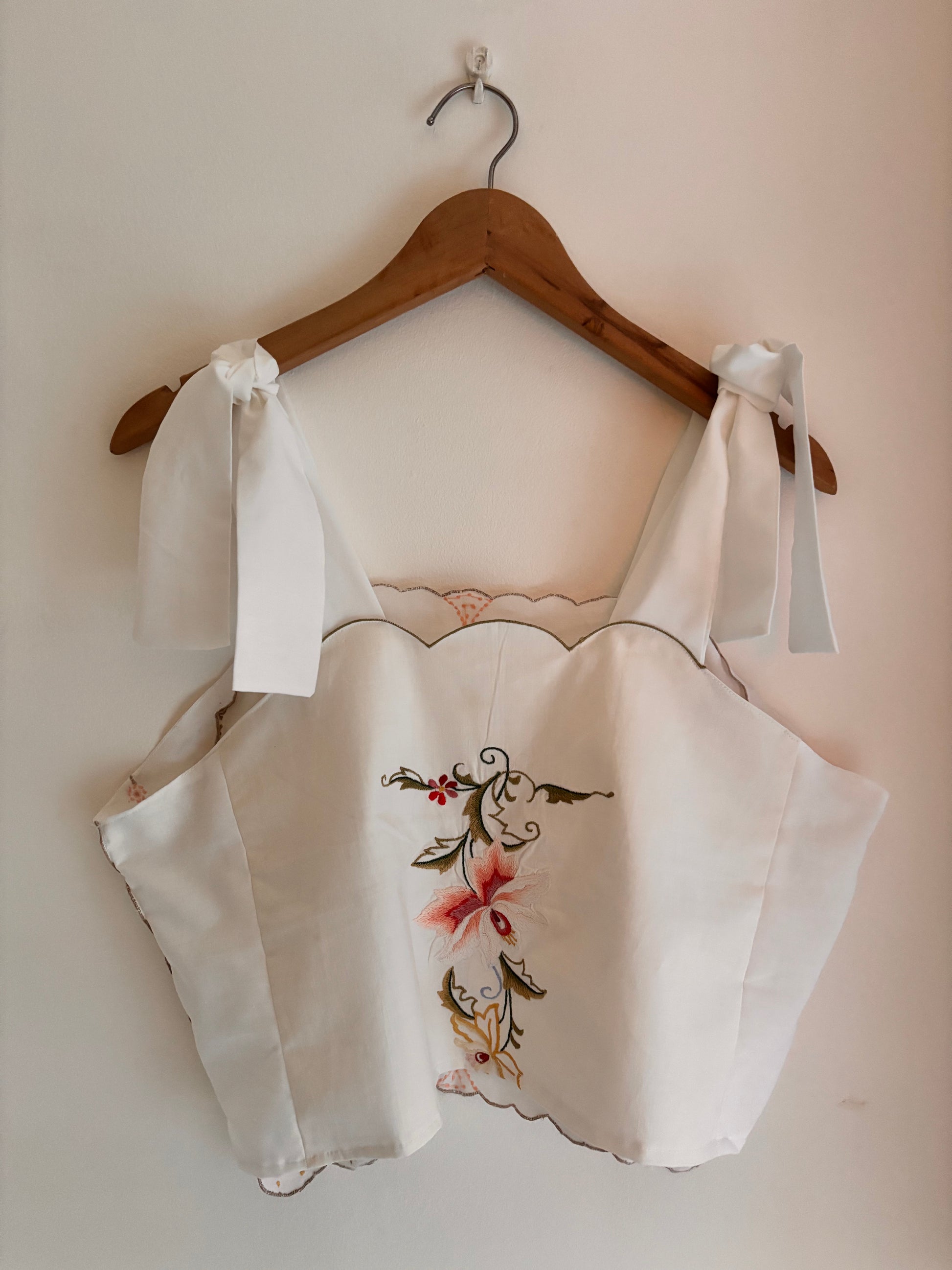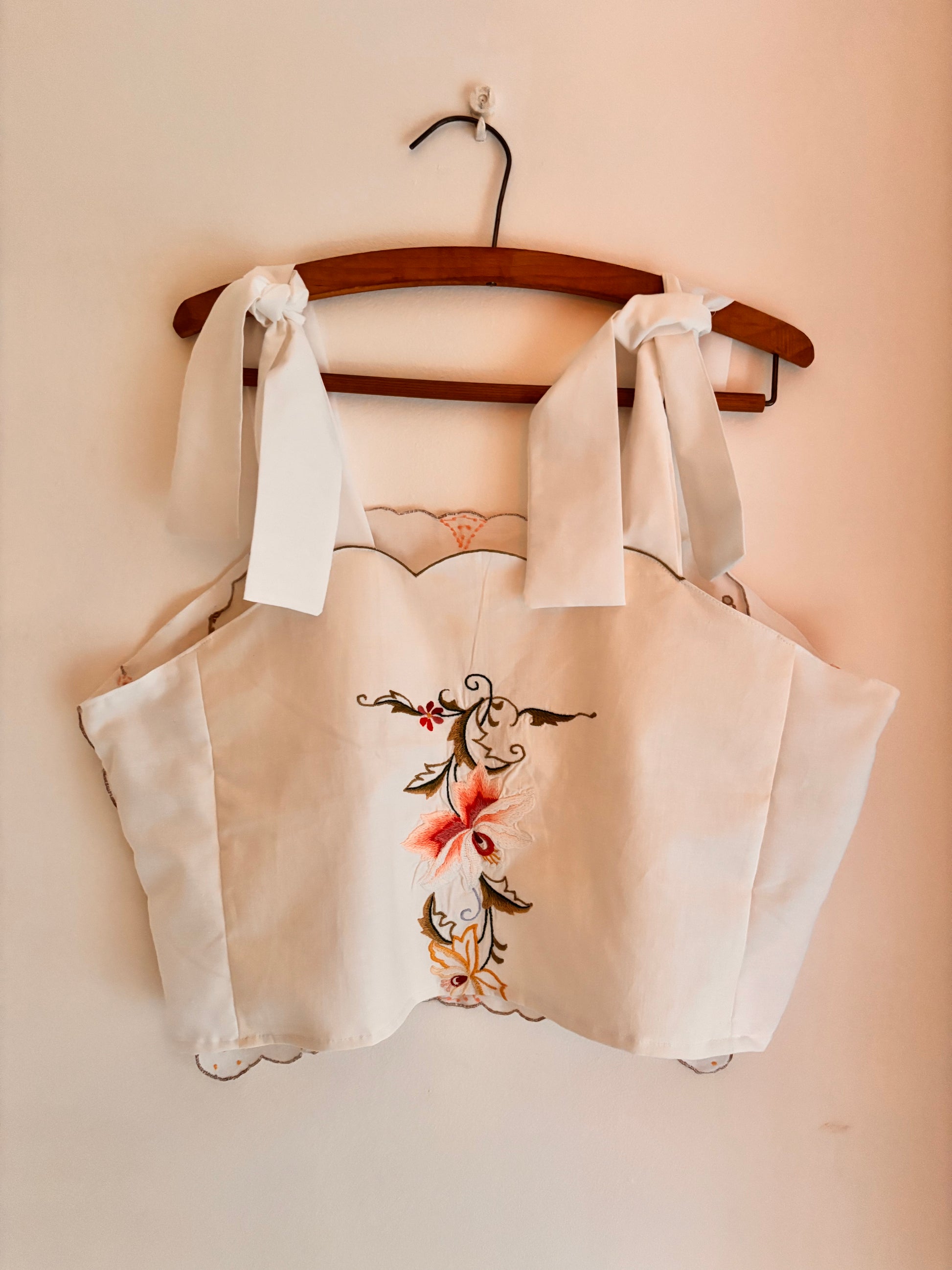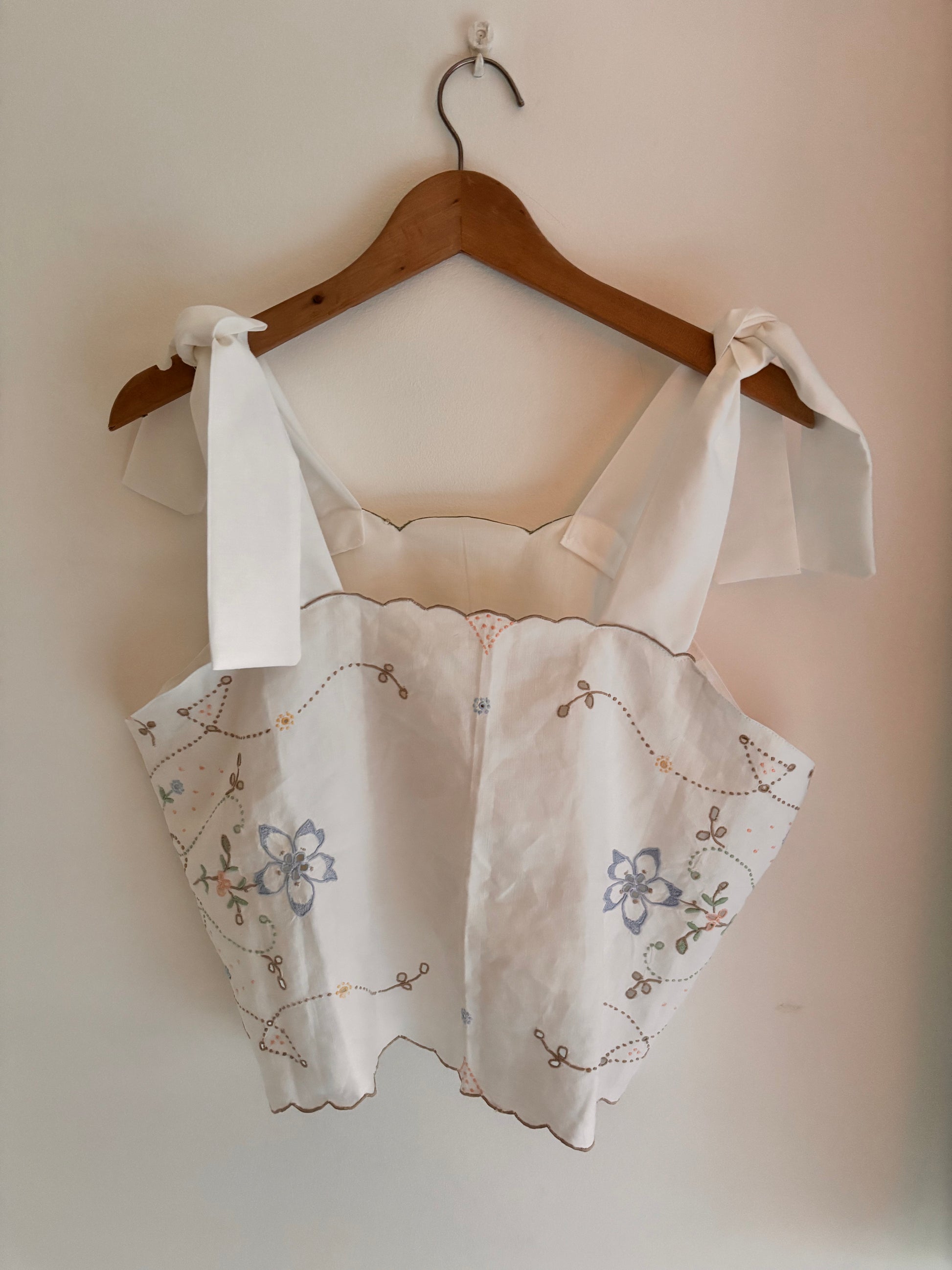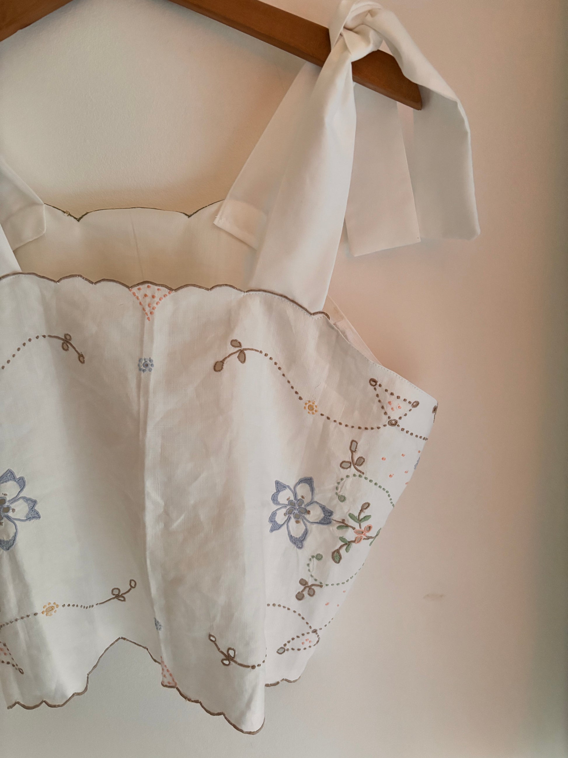 Bring a little garden-party charm into your everyday wardrobe with the Meadow Bloom Tie-Top. Handcrafted from vintage embroidered tablecloths, this boxy crop features wide adjustable tie straps, a flattering scalloped hem, and delicate floral detailing that tells a story in every stitch.