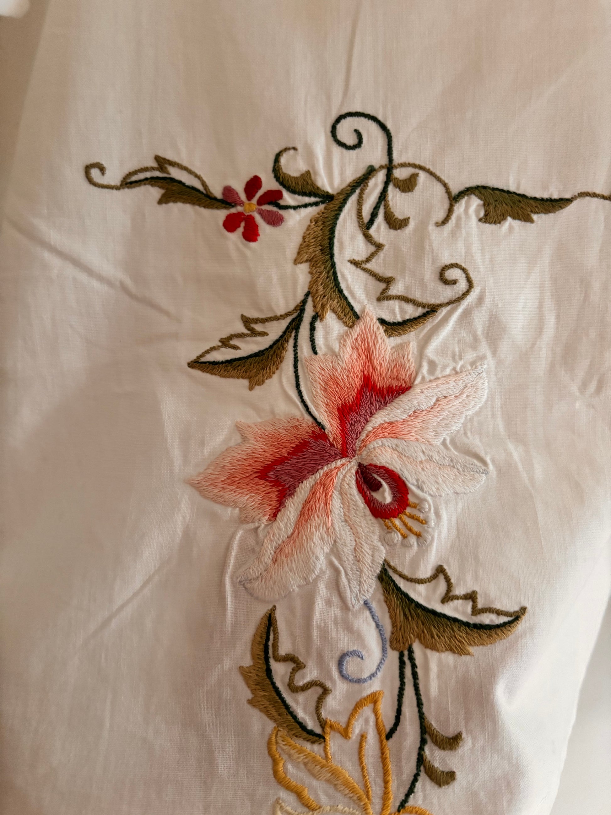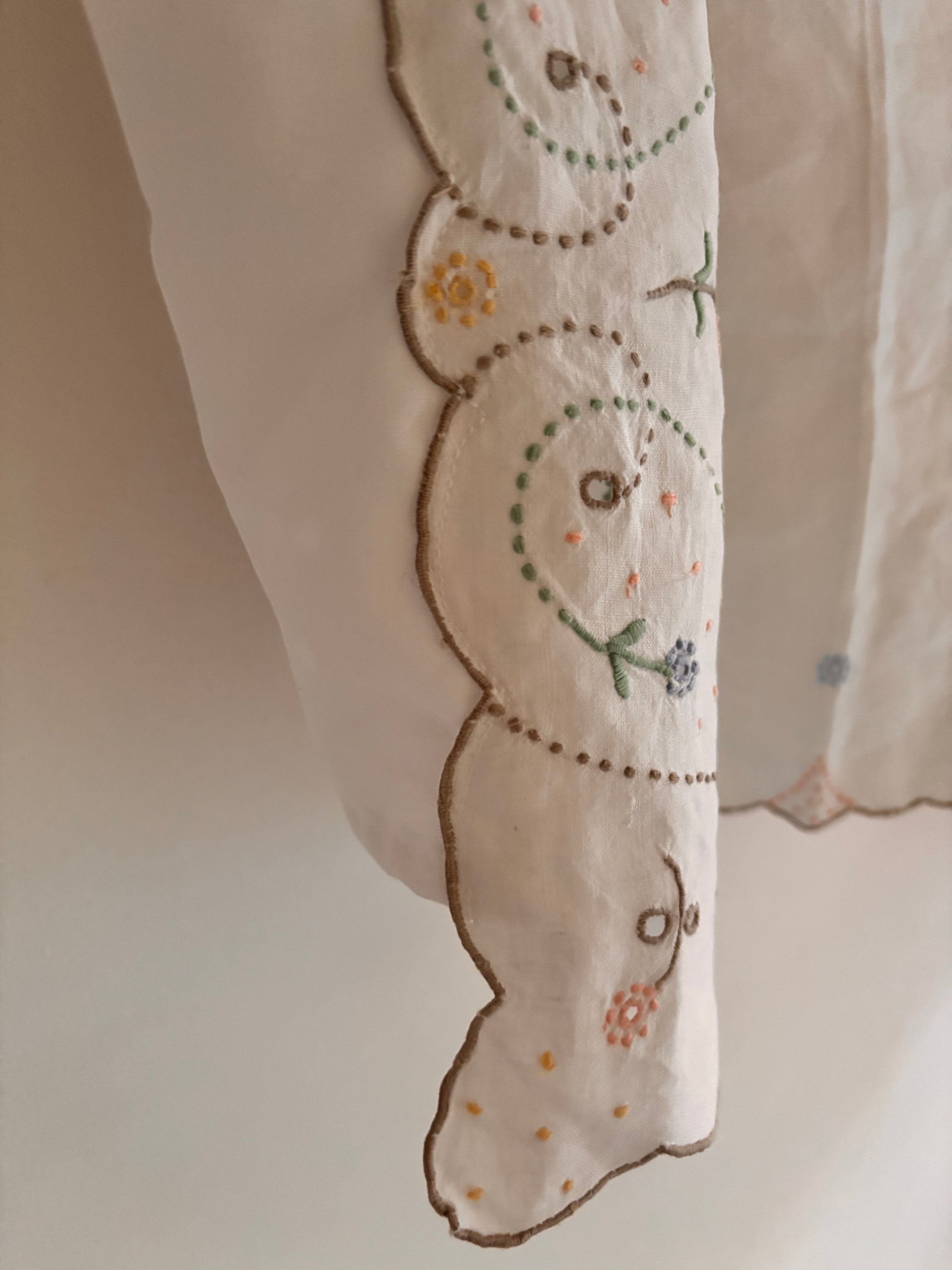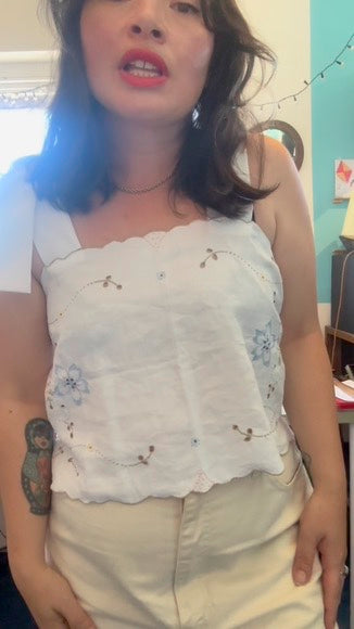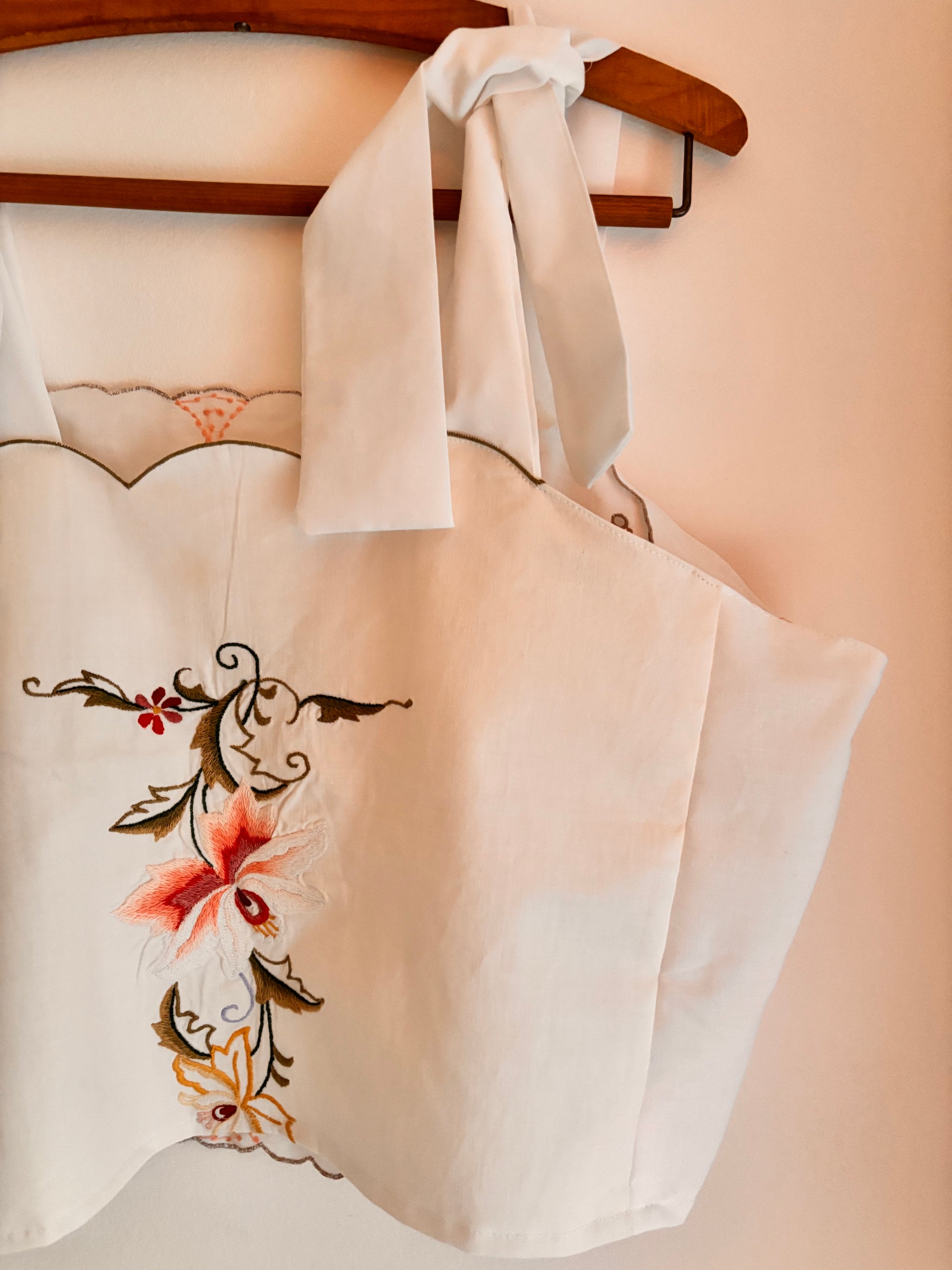 Bring a little garden-party charm into your everyday wardrobe with the Meadow Bloom Tie-Top. Handcrafted from vintage embroidered tablecloths, this boxy crop features wide adjustable tie straps, a flattering scalloped hem, and delicate floral detailing that tells a story in every stitch.