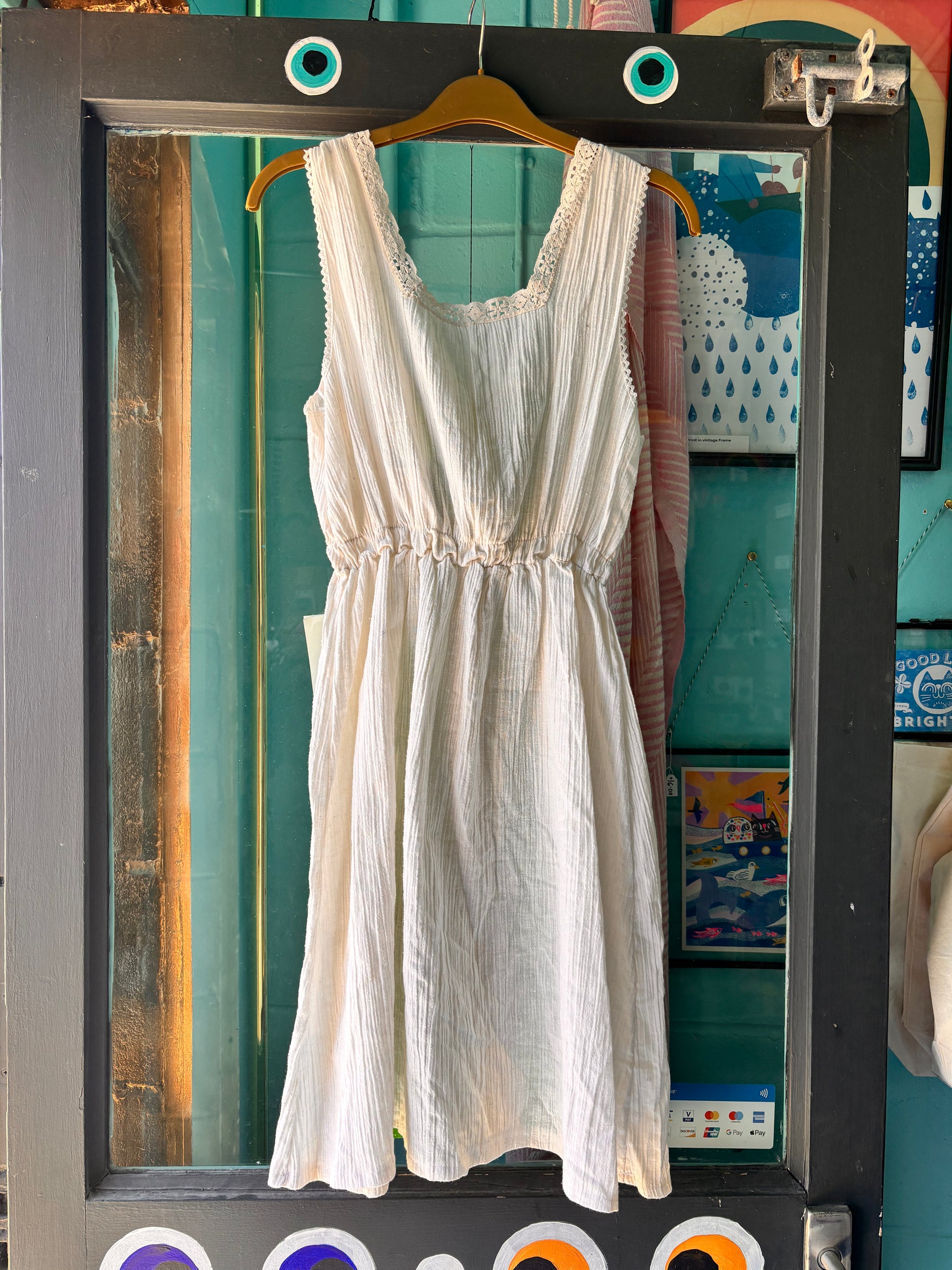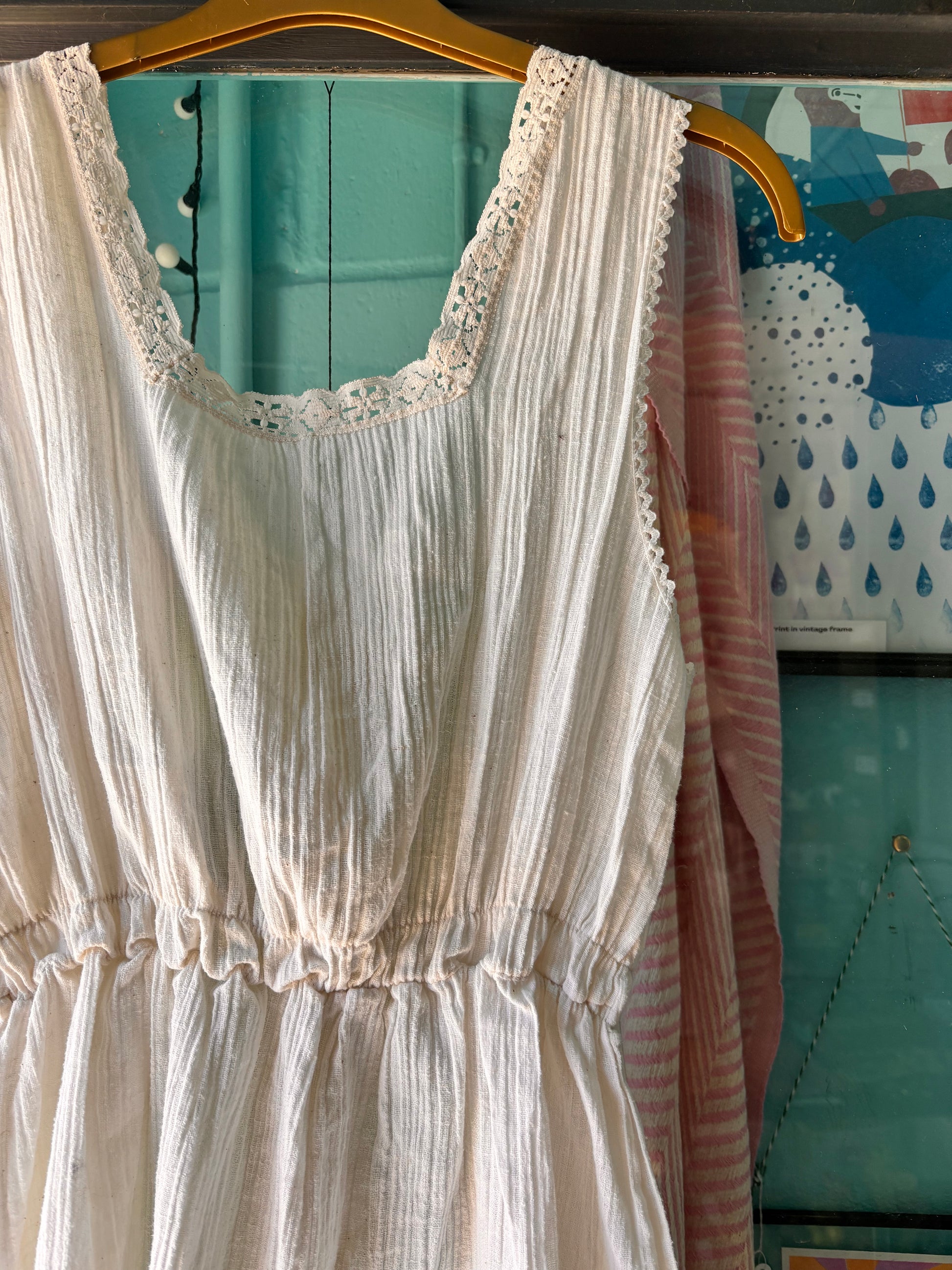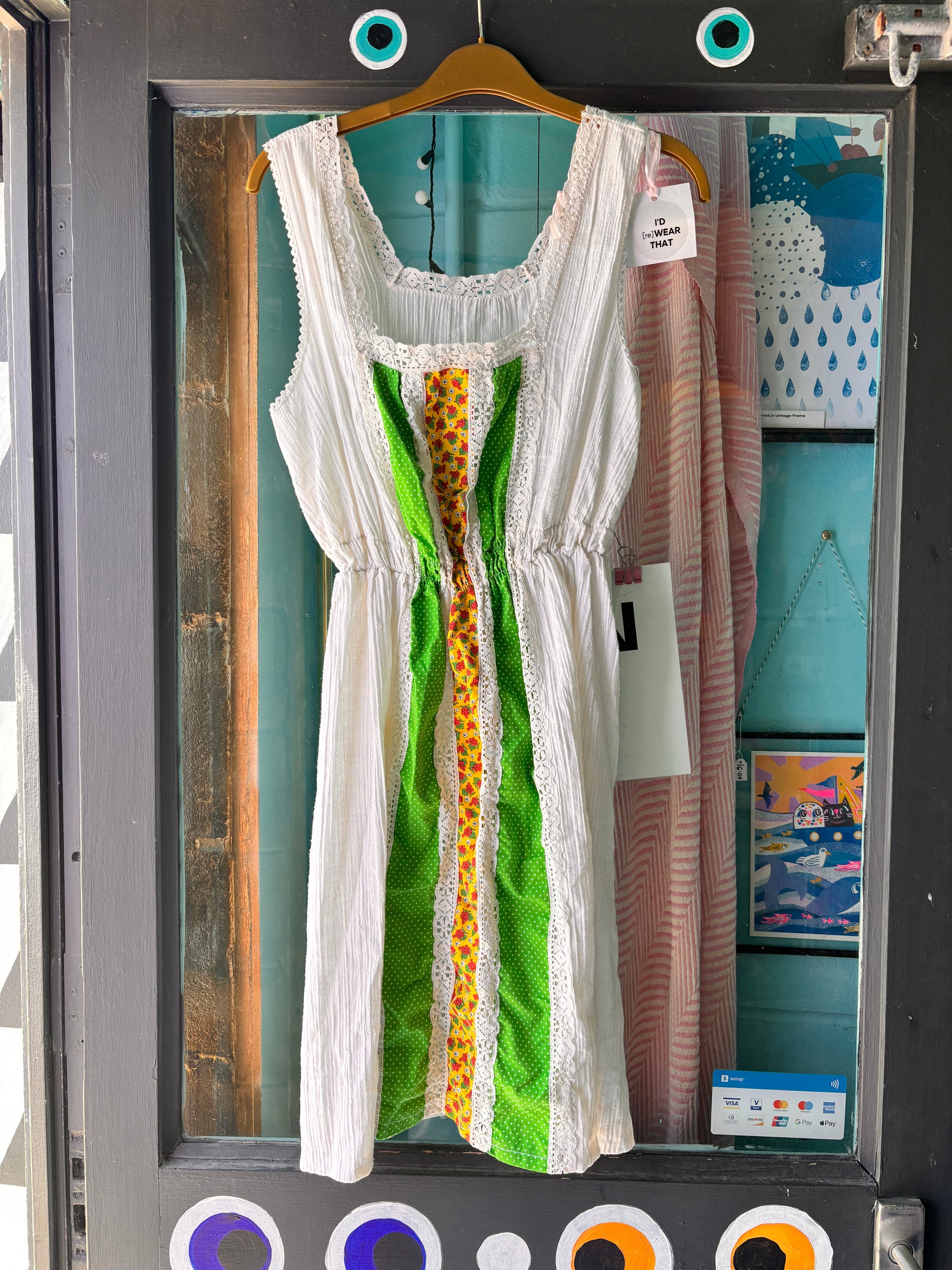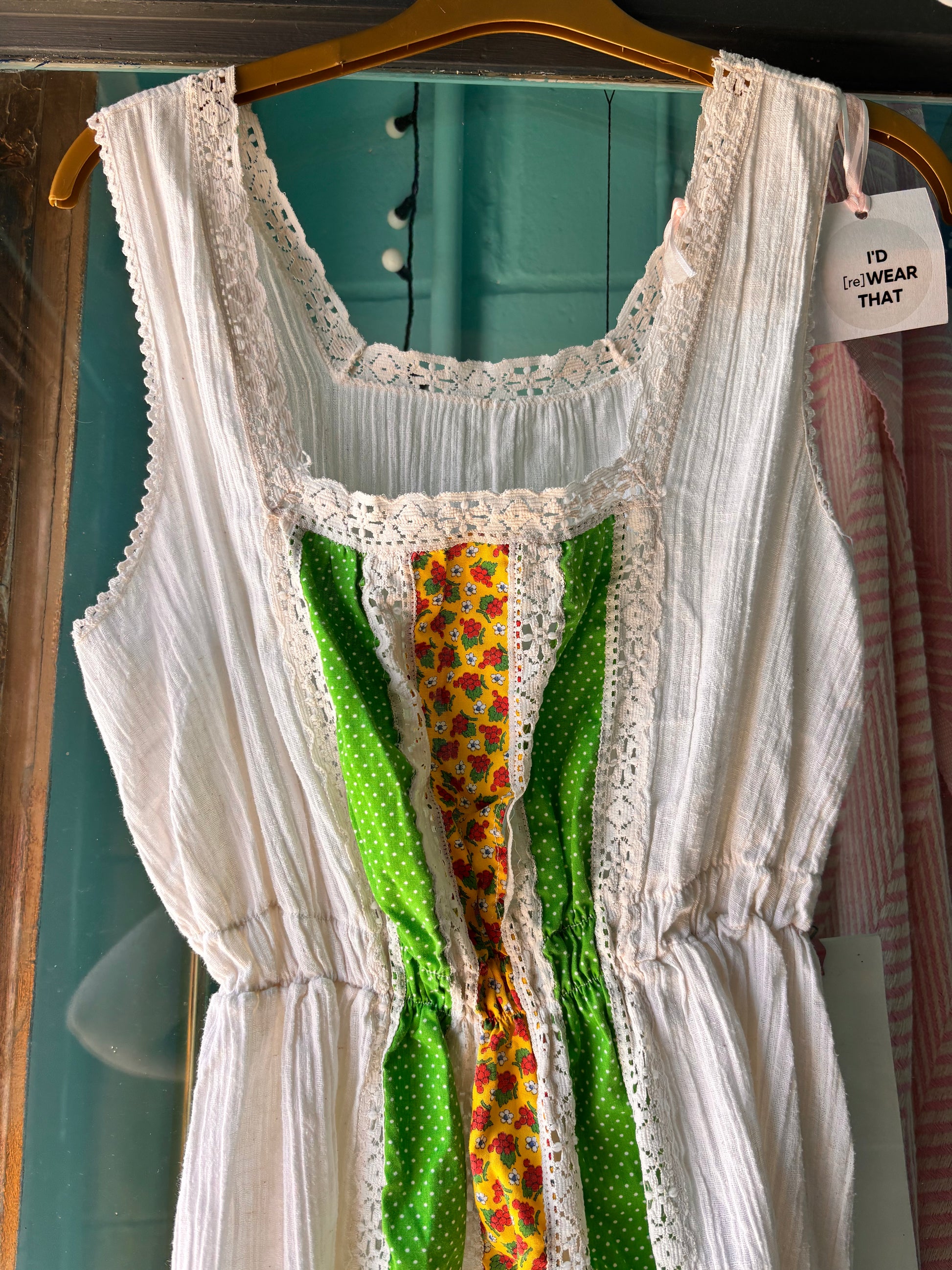 Soft as a summer breeze and brimming with countryside charm, the Wildberry Lace Top is stitched from vintage cream cheesecloth and detailed with delicate lace. The centre panel features green polka dots and a burst of yellow floral and wildberries, giving it a sweet retro twist. Finished with romantic tie straps and made entirely from reclaimed materials — this piece brings new life to forgotten fabrics.