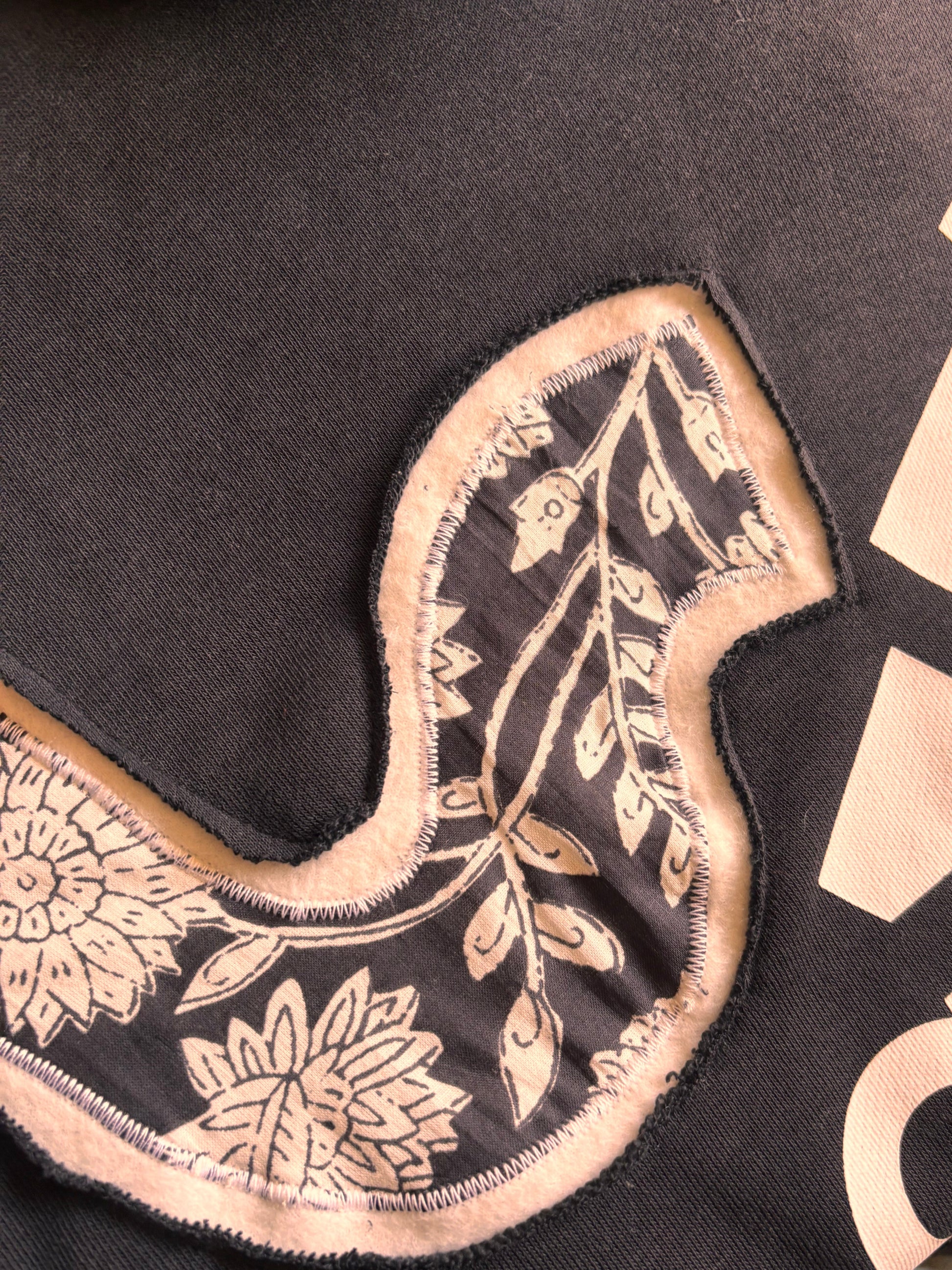 Stand out in a one-off upcycled Adidas hoodie. This preloved Adidas sweatshirt has been transformed with hand-cut, machine-stitched patchwork appliqué using recycled patterned fabrics. Each patch is individually placed and stitched, making this piece truly unique.