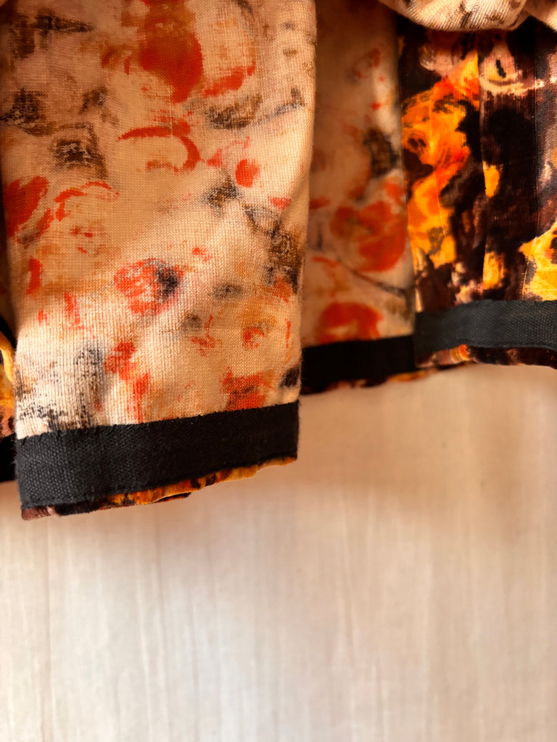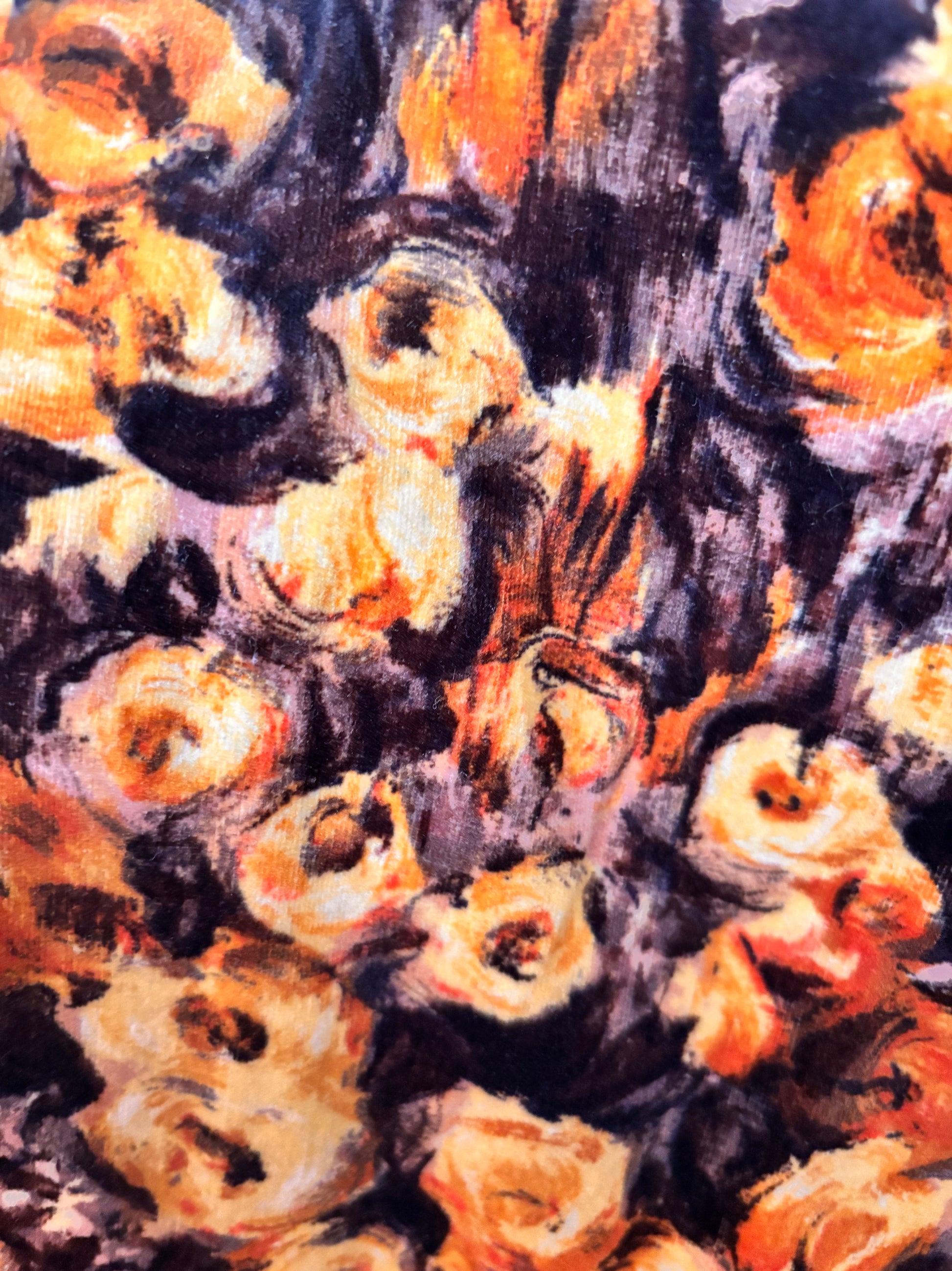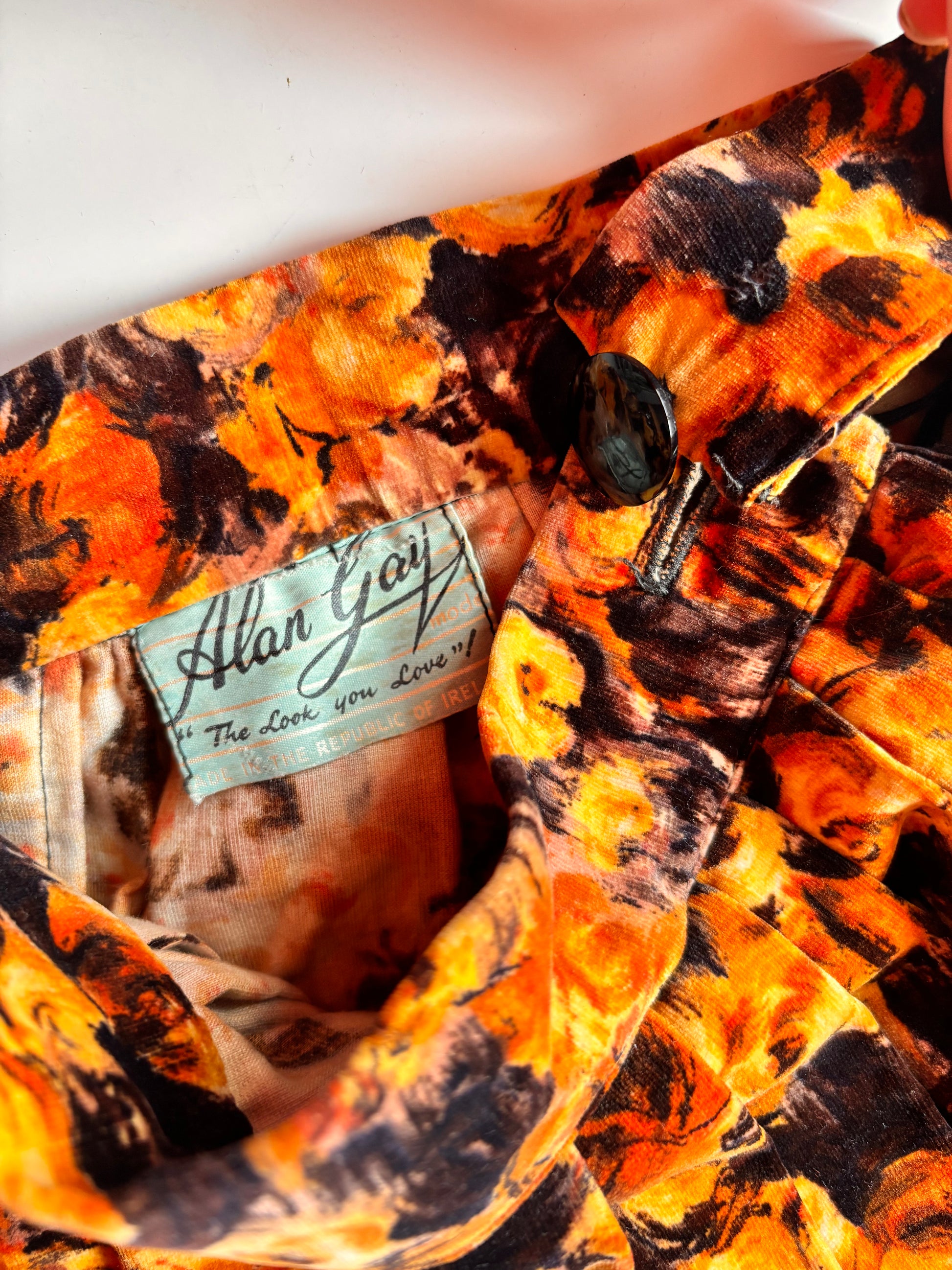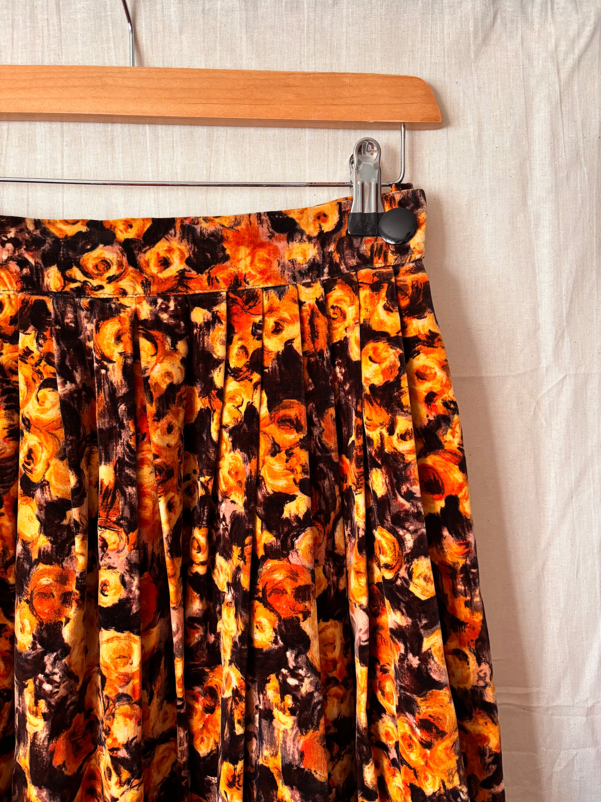 A truly special, authentic 1960s midi skirt by Irish label Alan Gay, featuring a beautiful painterly rose print in rich autumnal tones of rust, caramel and deep brown.