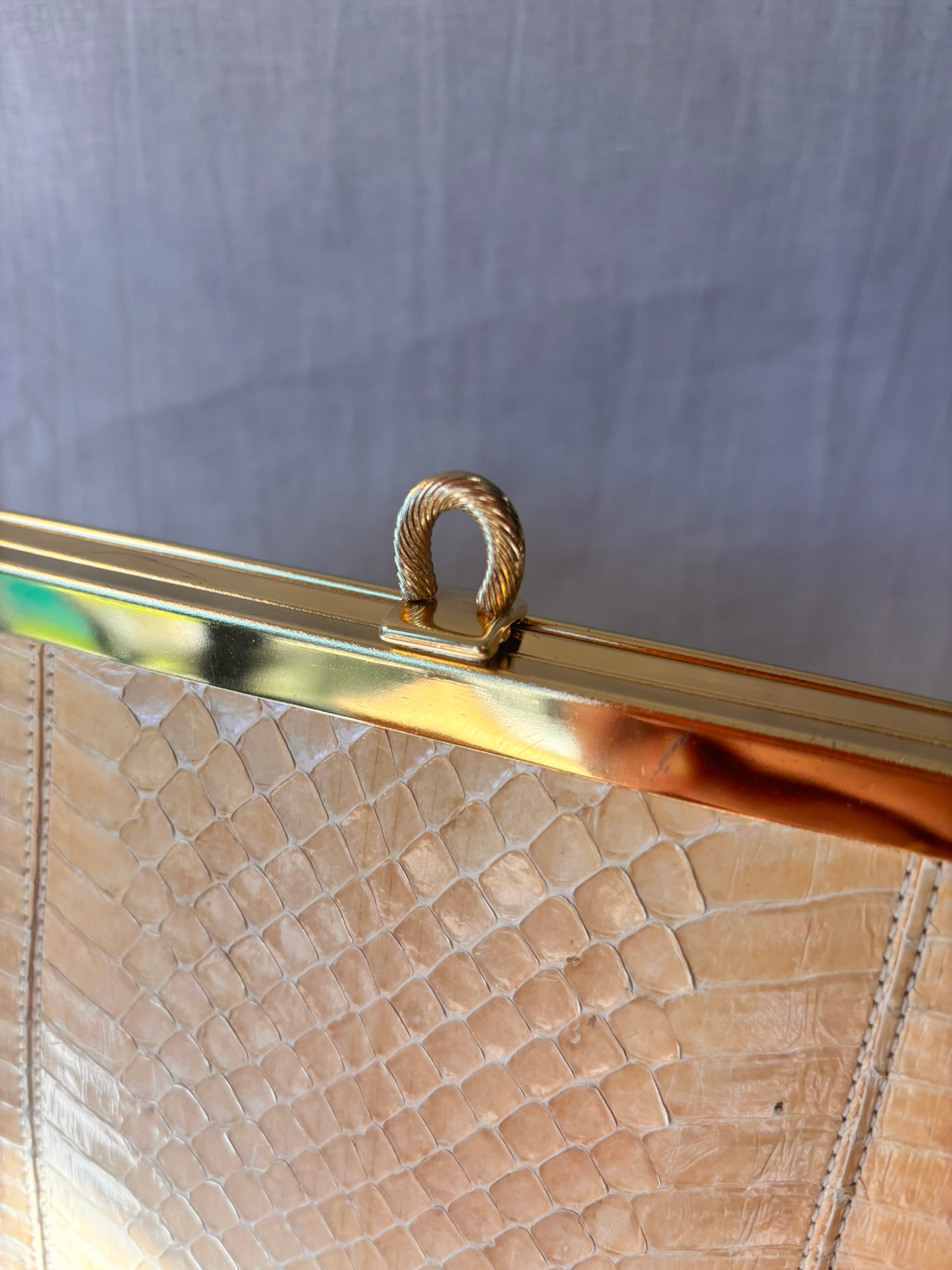 A truly special vintage find... this elegant, structured clutch is crafted from genuine snakeskin in a beautiful and soft neutral tone, making it an effortlessly timeless piece.